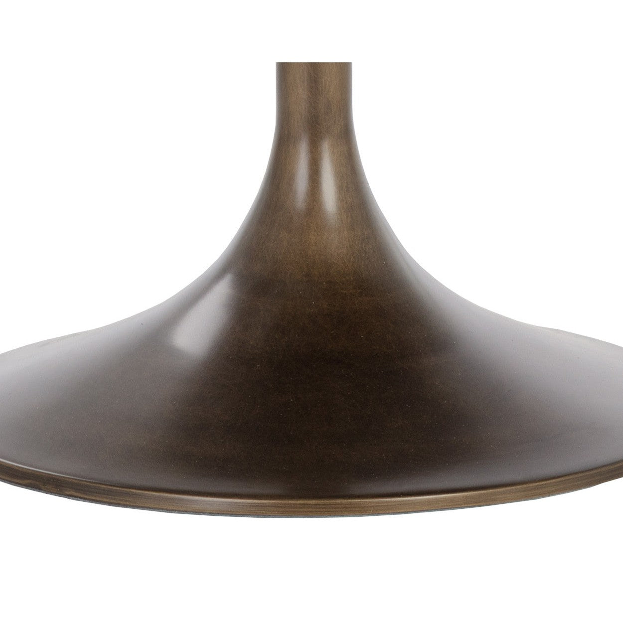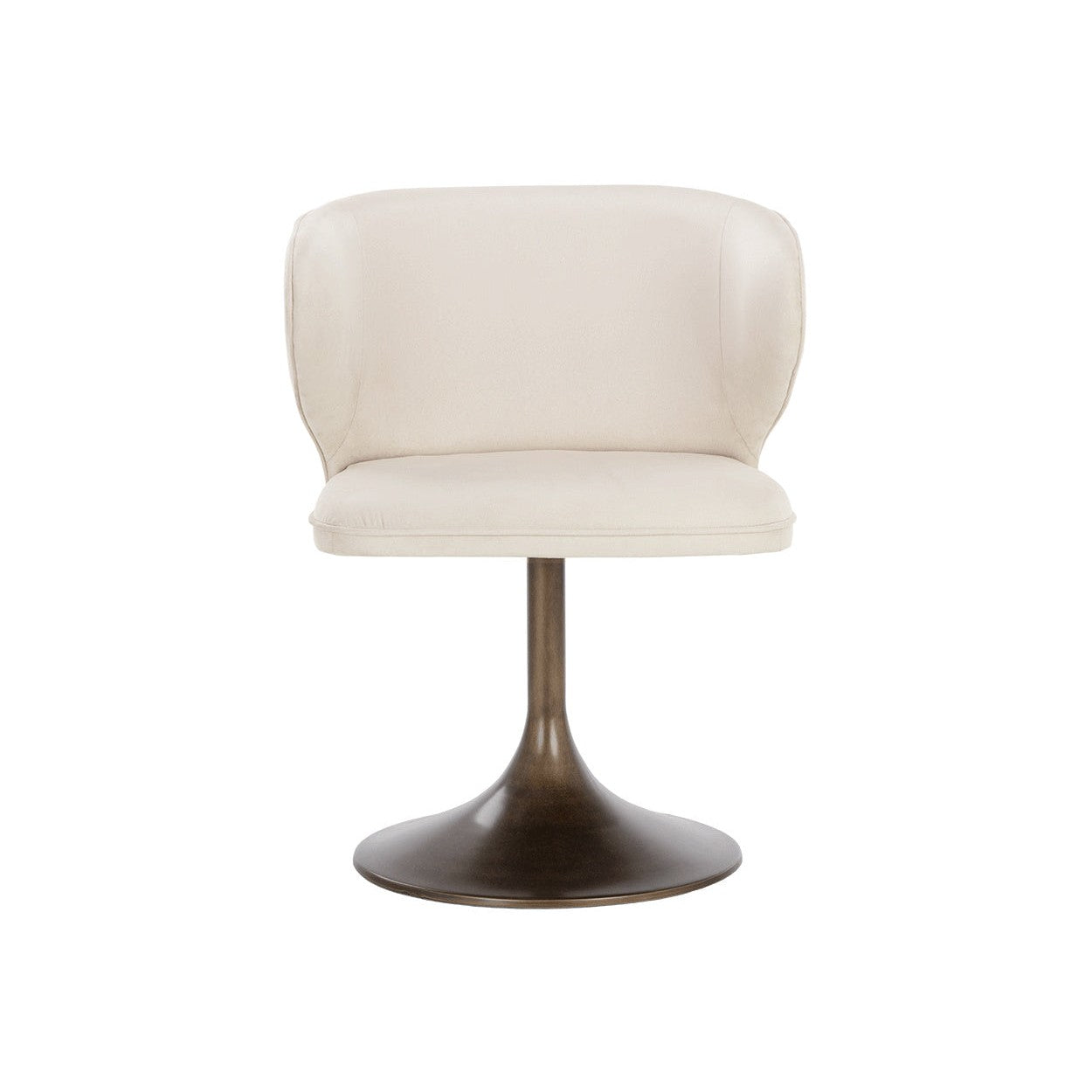 Create a captivating dining space with this eye-catching swivel dining chair that has a contemporary flair. Stocked in casablanca cloud performance fabric and completed with a round, antique brass stainless steel base. Performance fabric is moisture repellent, durable and easy to clean.