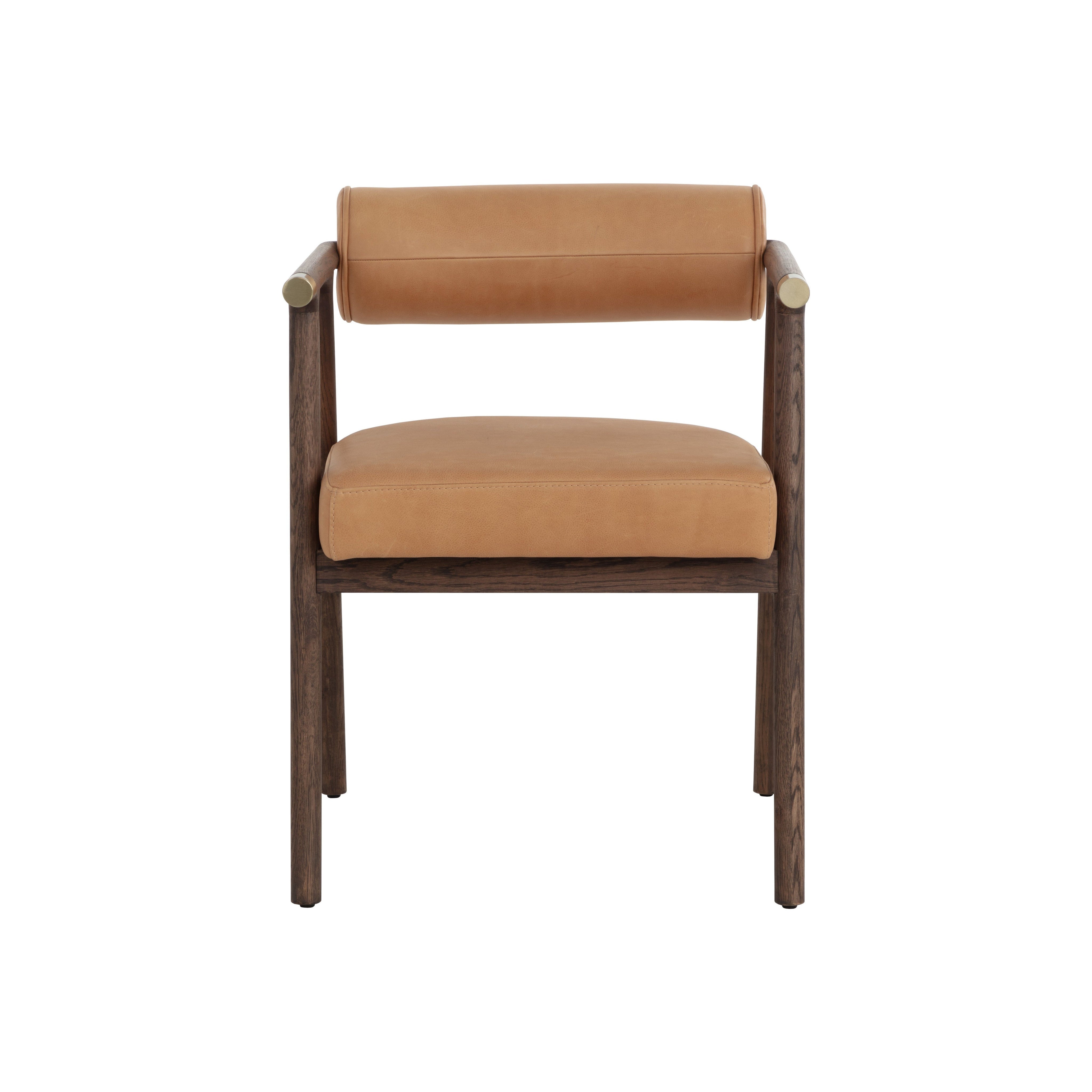 The attractive profile of the Sova Dining Armchair encapsulates modern sophistication. Oak wood, sahara camel leather and brushed brass metal caps create a timeless combination of refined materials.