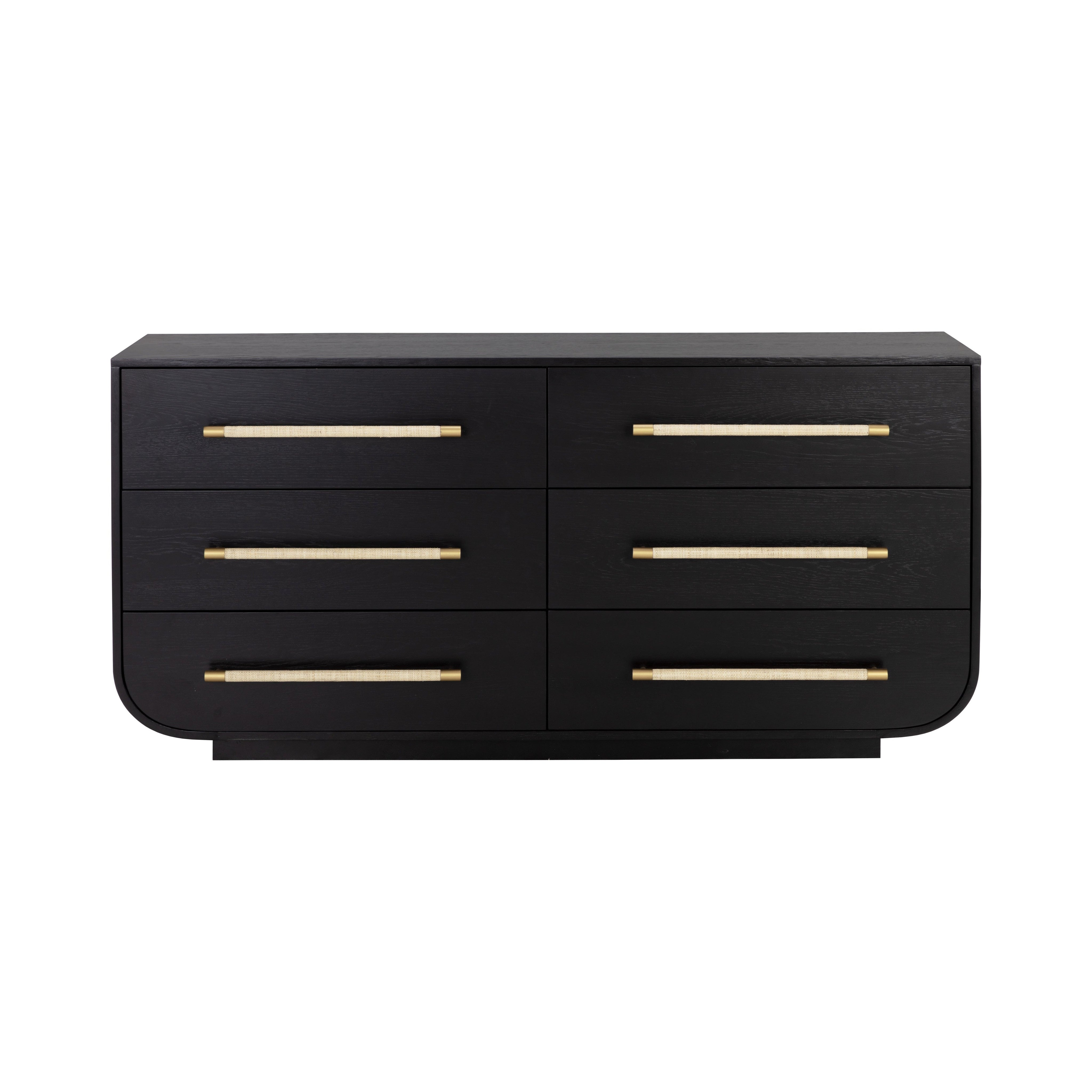 Fluid lines and gentle curves make up the modern silhouette of the Tarrant Dresser. Raffia wrapped handles add an understated touch to the black oak veneer base. Handle With Care: This design has been crafted with raffia. Each item will exhibit unique traits such as texture and thickness variations that add to the natural character of this finely woven material. Visit our Product Care page for more information on how to ensure the lasting beauty of this piece.
