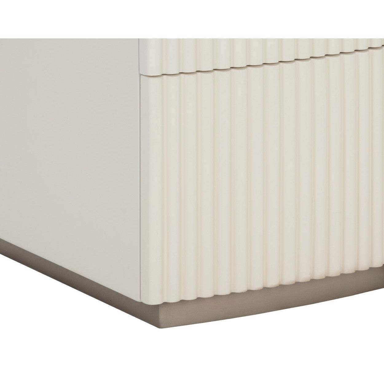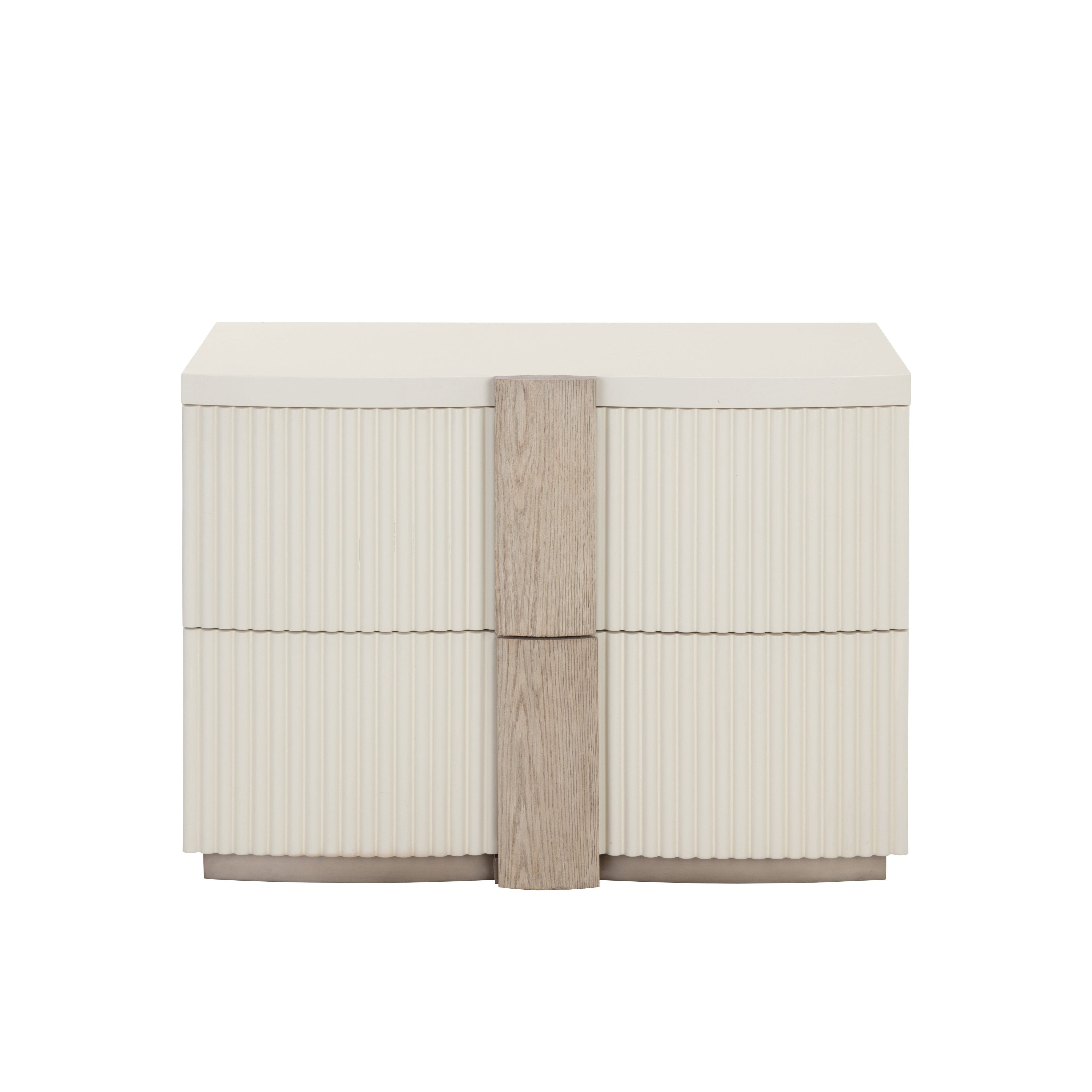 Spacious and stylish, the Venetta Nightstand will elevate any bedroom space. Smooth light oak wood handles beautifully complement the cream base and reeded drawers. As wood is an organic, porous material, these pieces will contain natural variation of texture and may also exhibit fine indentations and cracks. Wood pieces will also display a disparity of colour and grain, and visible knots and burls that add to the character of each piece.