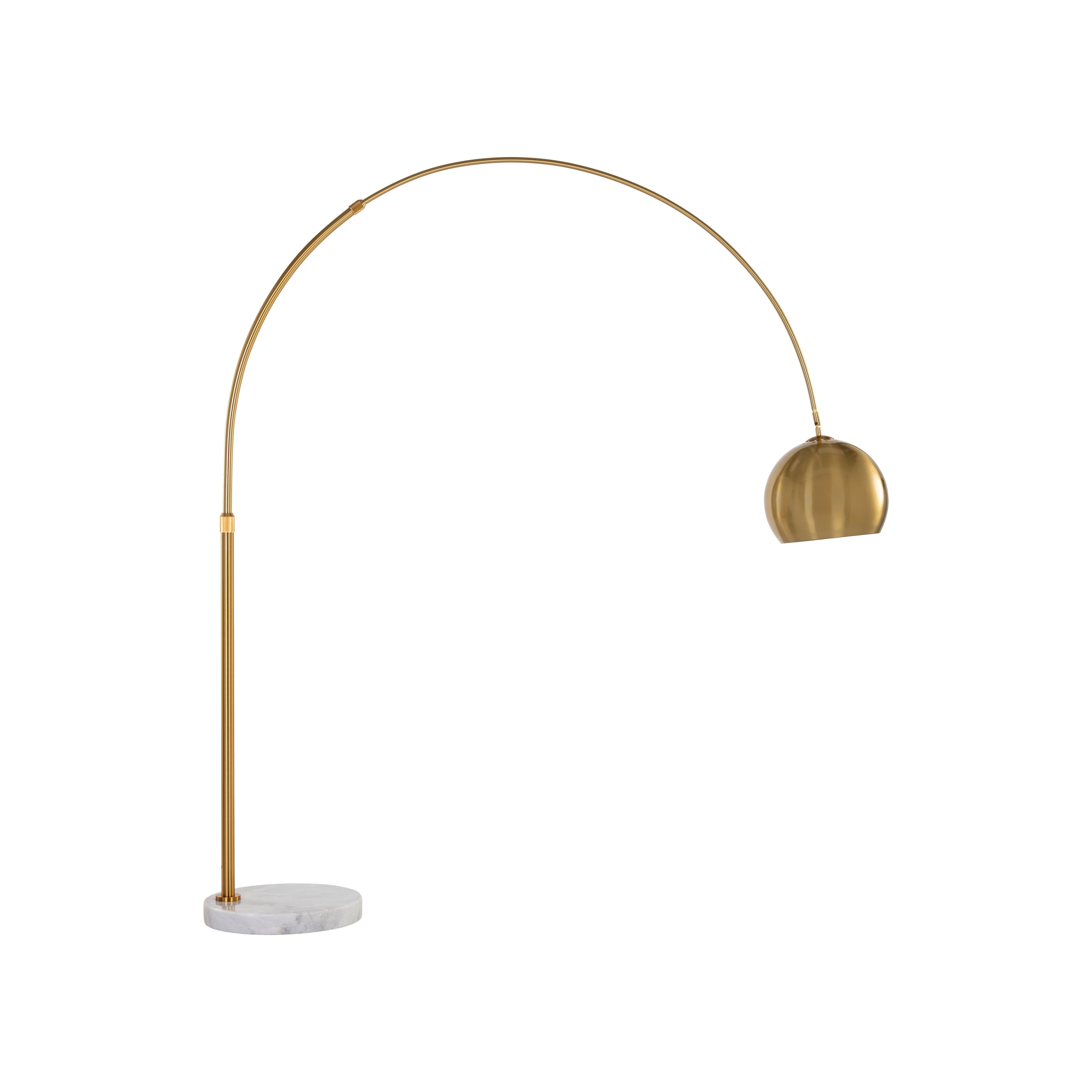 With a sweeping arc, this bold lamp will define living, lounge and office spaces with style. Features a globe shade in brass iron with a white marble base. As marble is a natural material, unique veining, pitting, fissures, micro-cracks and colour variations are all characteristics that add to the uniqueness and beauty of each piece.