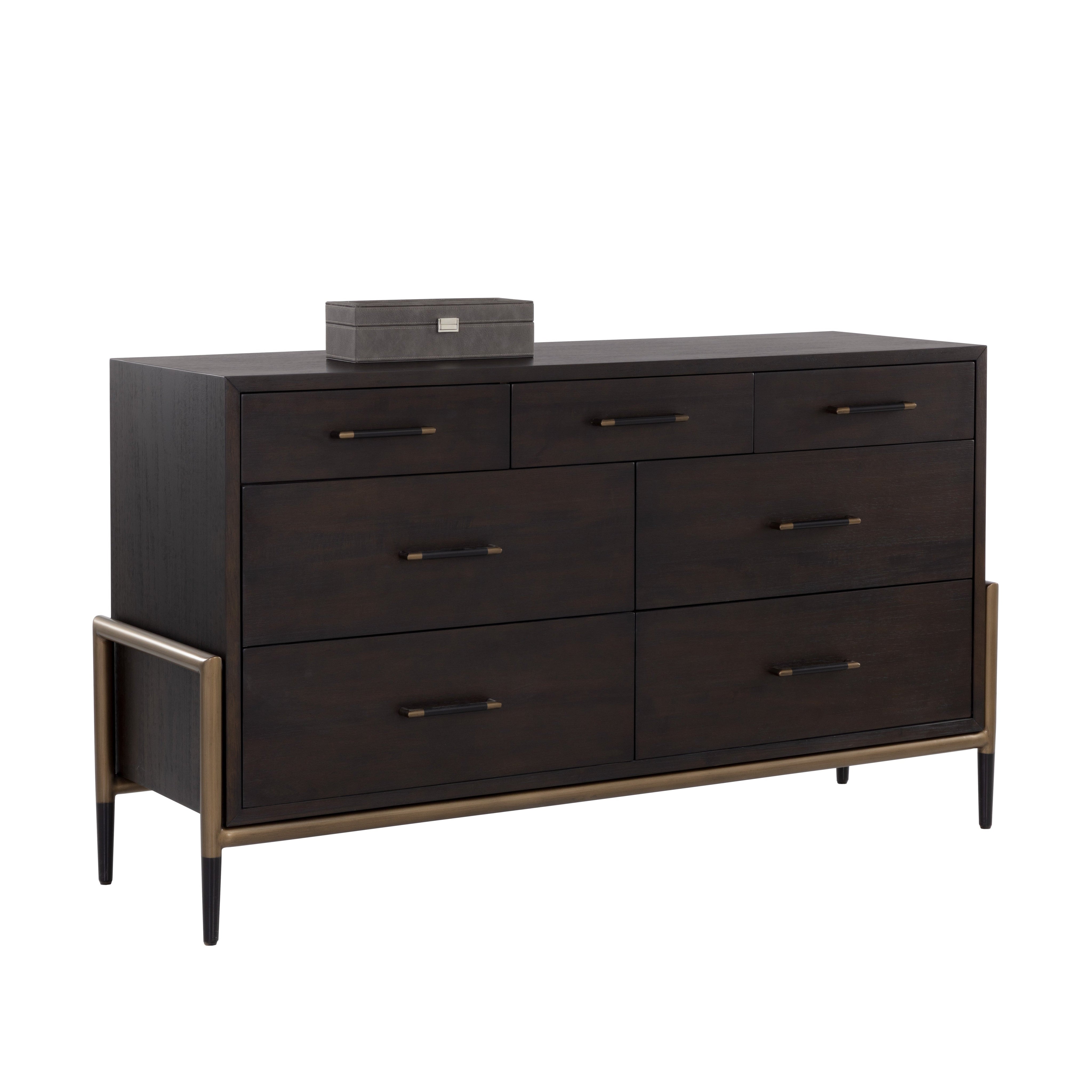 Make a statement with this stylish dresser that exudes prestige. Features a espresso acacia wood veneer with seven soft closing drawers. Completed with black and antique brass iron handles with coordinating base. As wood is an organic, porous material, these pieces will contain natural variation of texture and may also exhibit fine indentations and cracks. Wood pieces will also display a disparity of colour and grain, and visible knots and burls that add to the character of each piece.