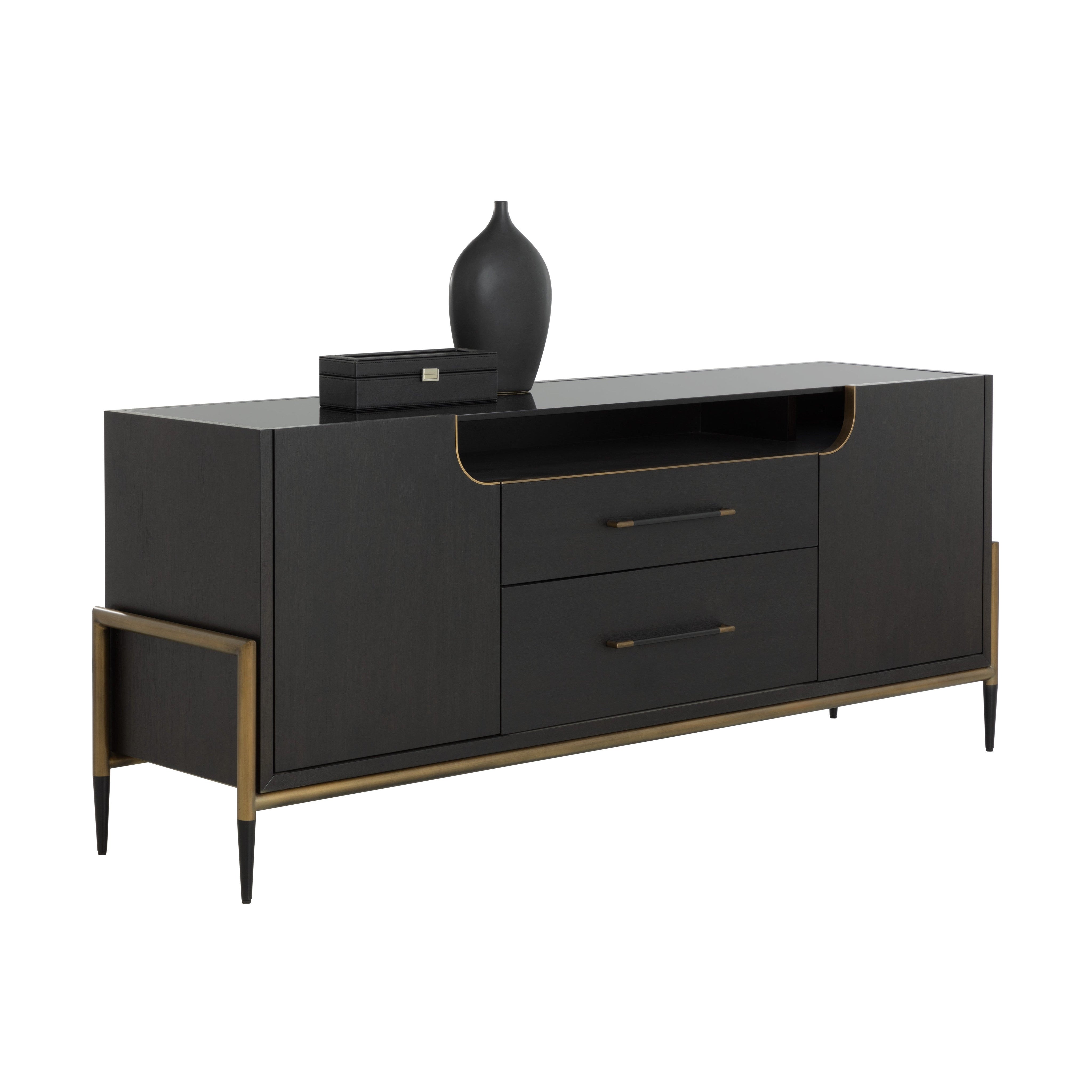 Make a statement with this stylish sideboard that exudes prestige. Features a espresso acacia wood veneer with two soft closing drawers. Completed with black and antique brass iron handles with a coordinating base. As wood is an organic, porous material, these pieces will contain natural variation of texture and may also exhibit fine indentations and cracks. Wood pieces will also display a disparity of colour and grain, and visible knots and burls that add to the character of each piece.