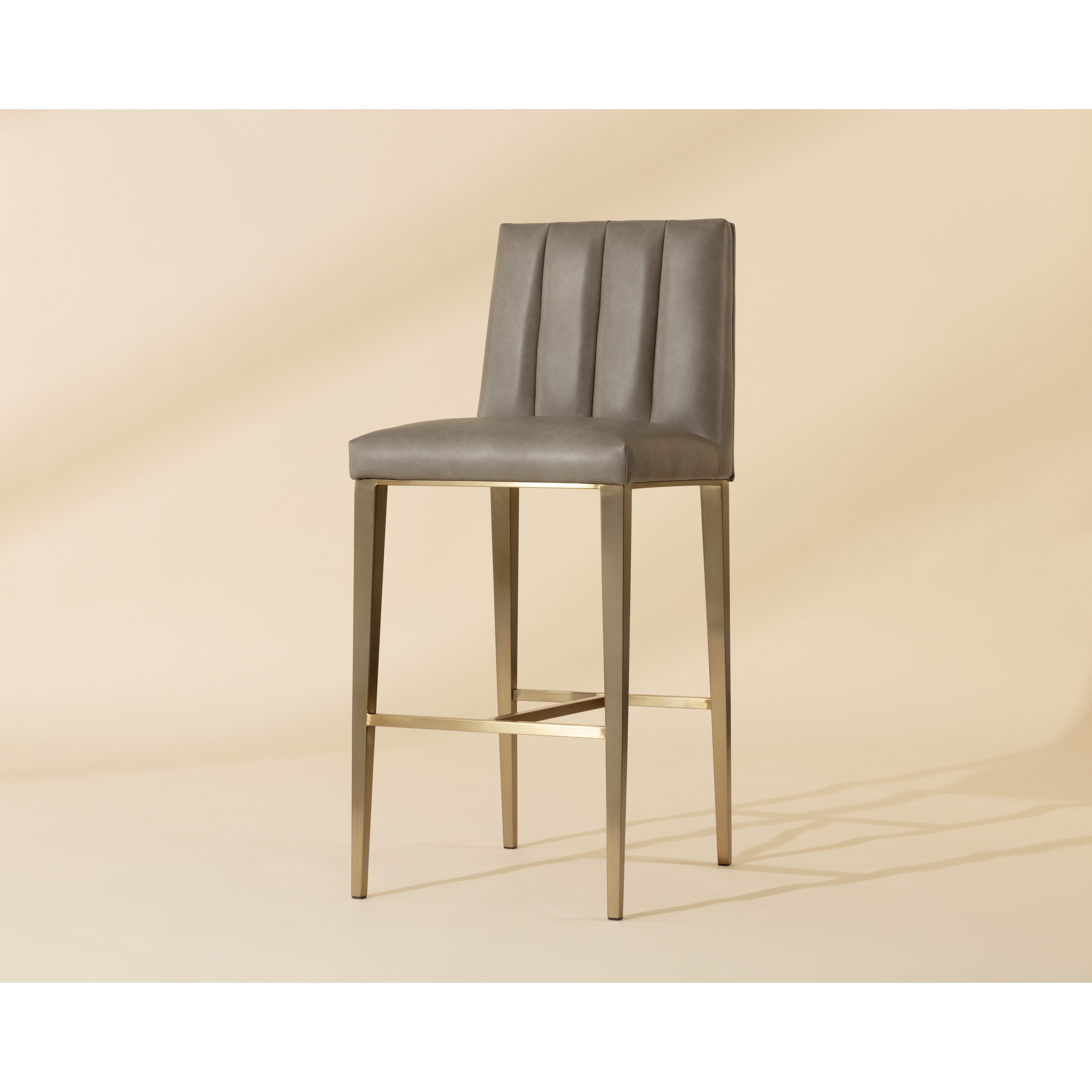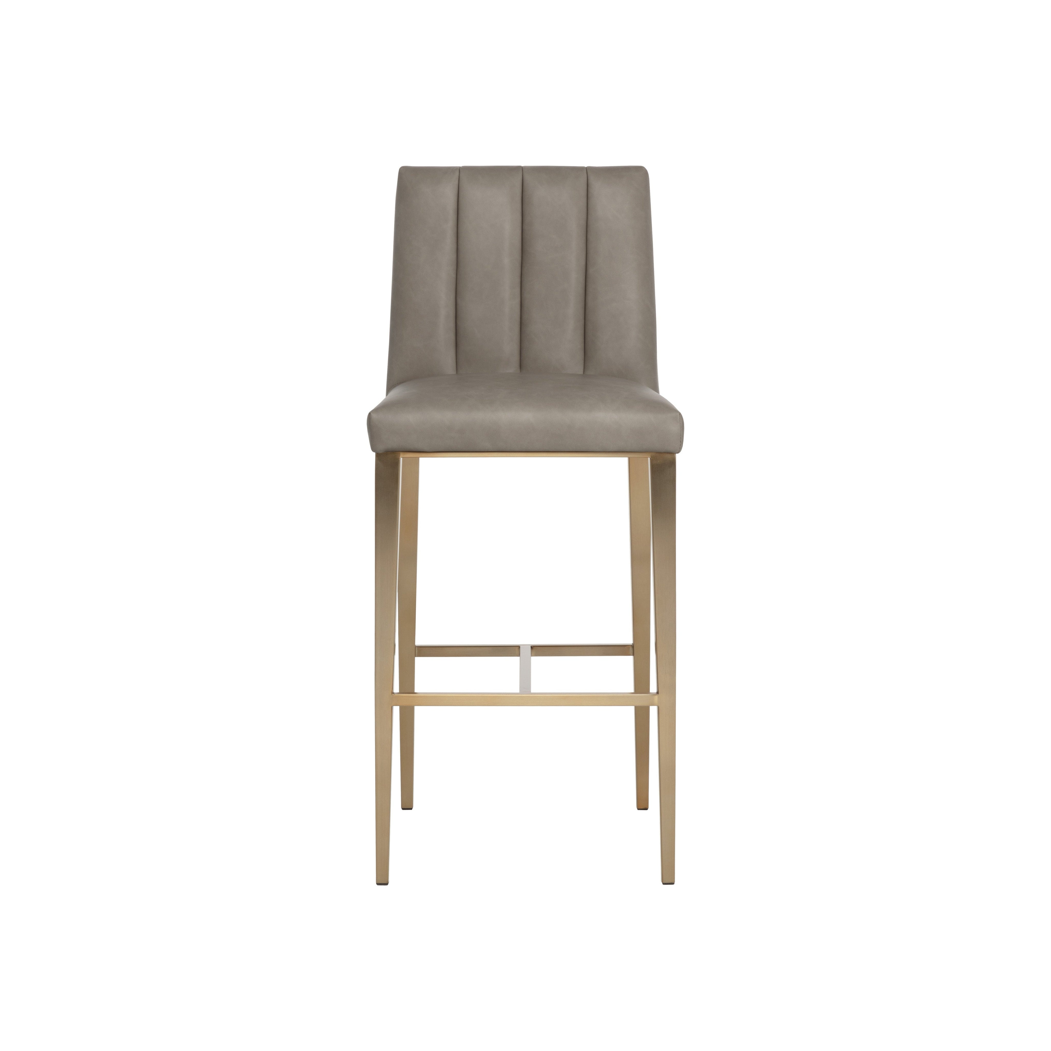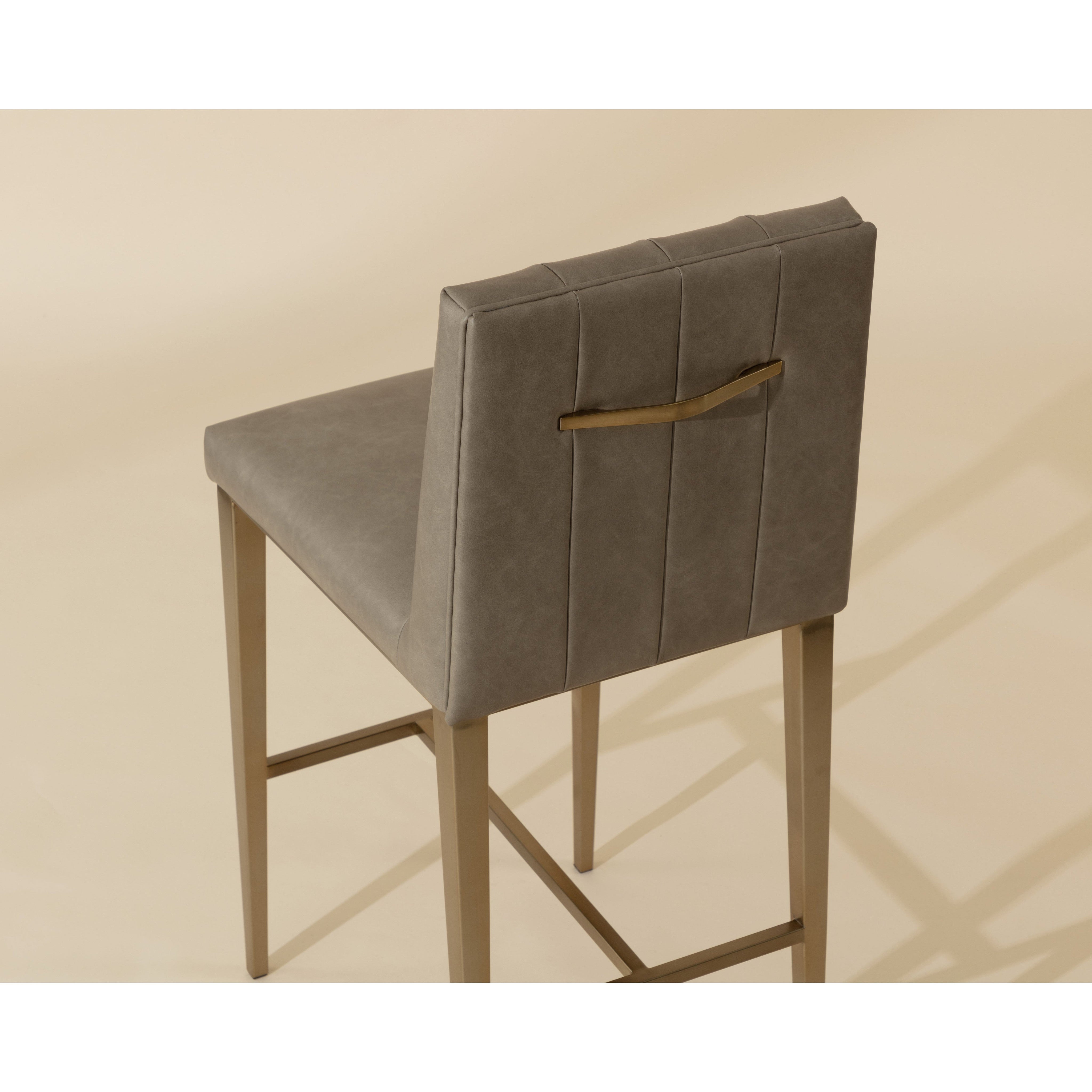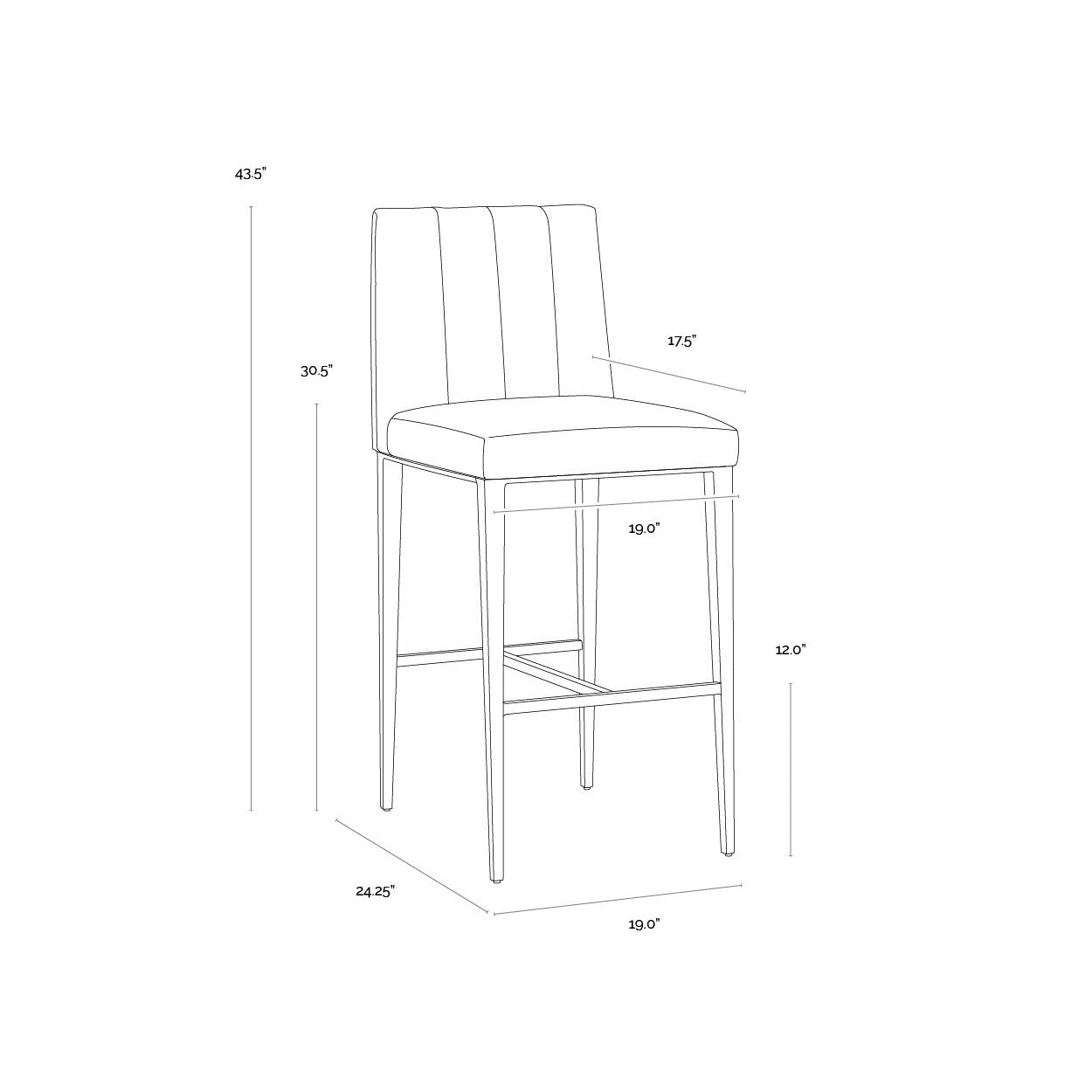 Minimal and classic best describes the Wilbur Barstool. Upholstered in milliken cognac faux leather with vertical channeling on the back seat for added flair. Finished with powder-coated stainless steel legs and a matching decorative handle.