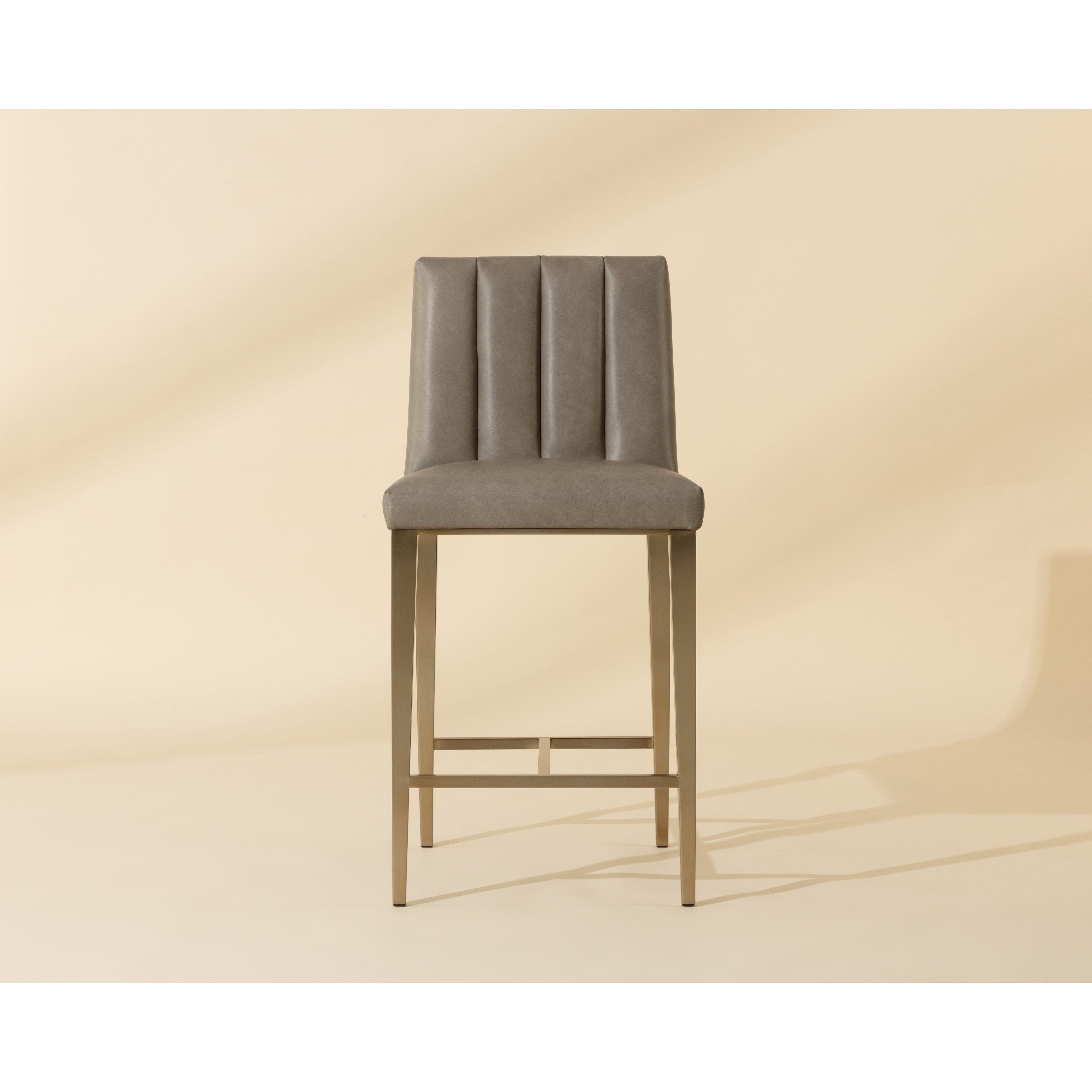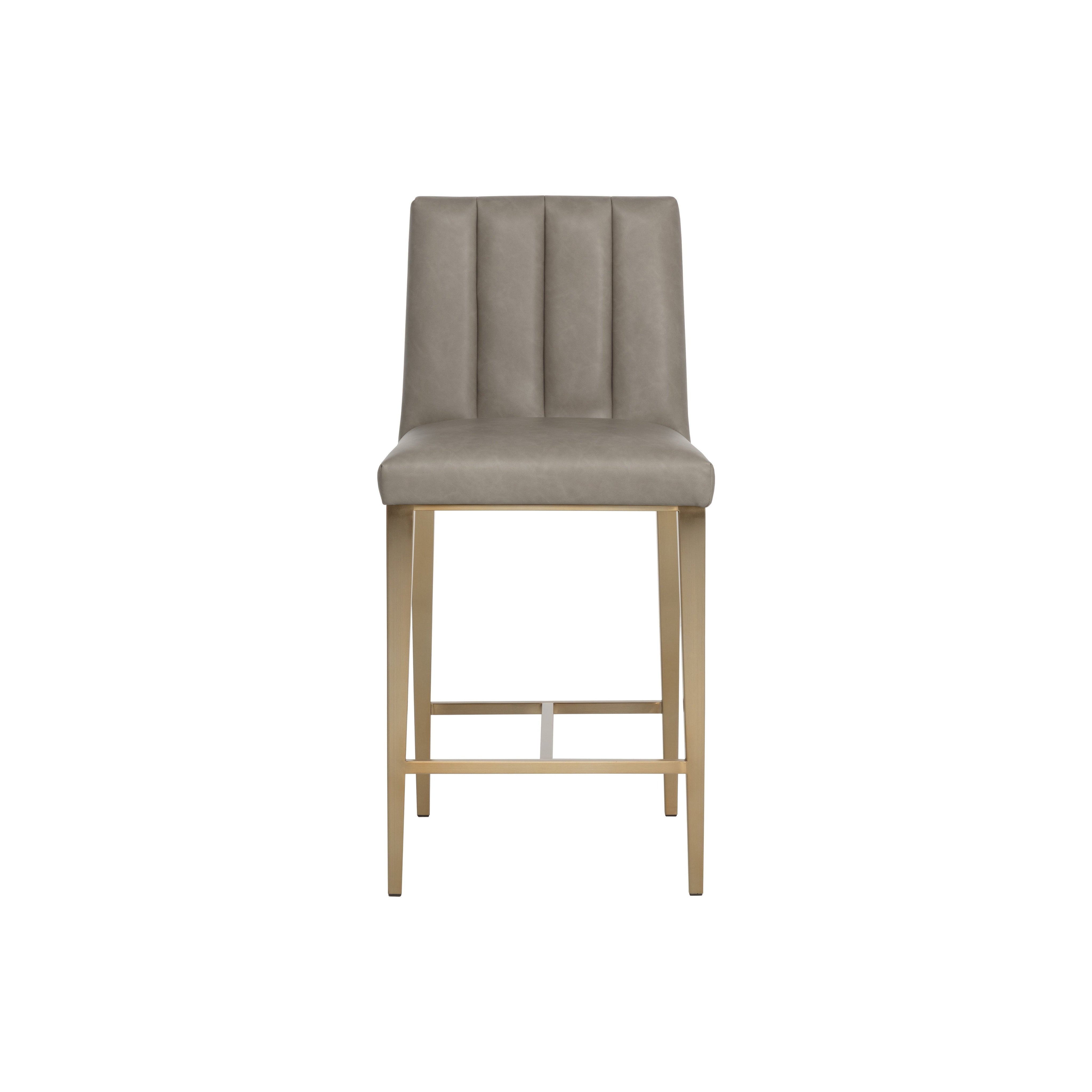 Minimal and classic bests describe the Wilbur Counter Stool. Upholstered in milliken cognac faux leather with vertical channeling on the back seat for added flair. Finished with powder-coated stainless steel legs and a matching decorative handle.