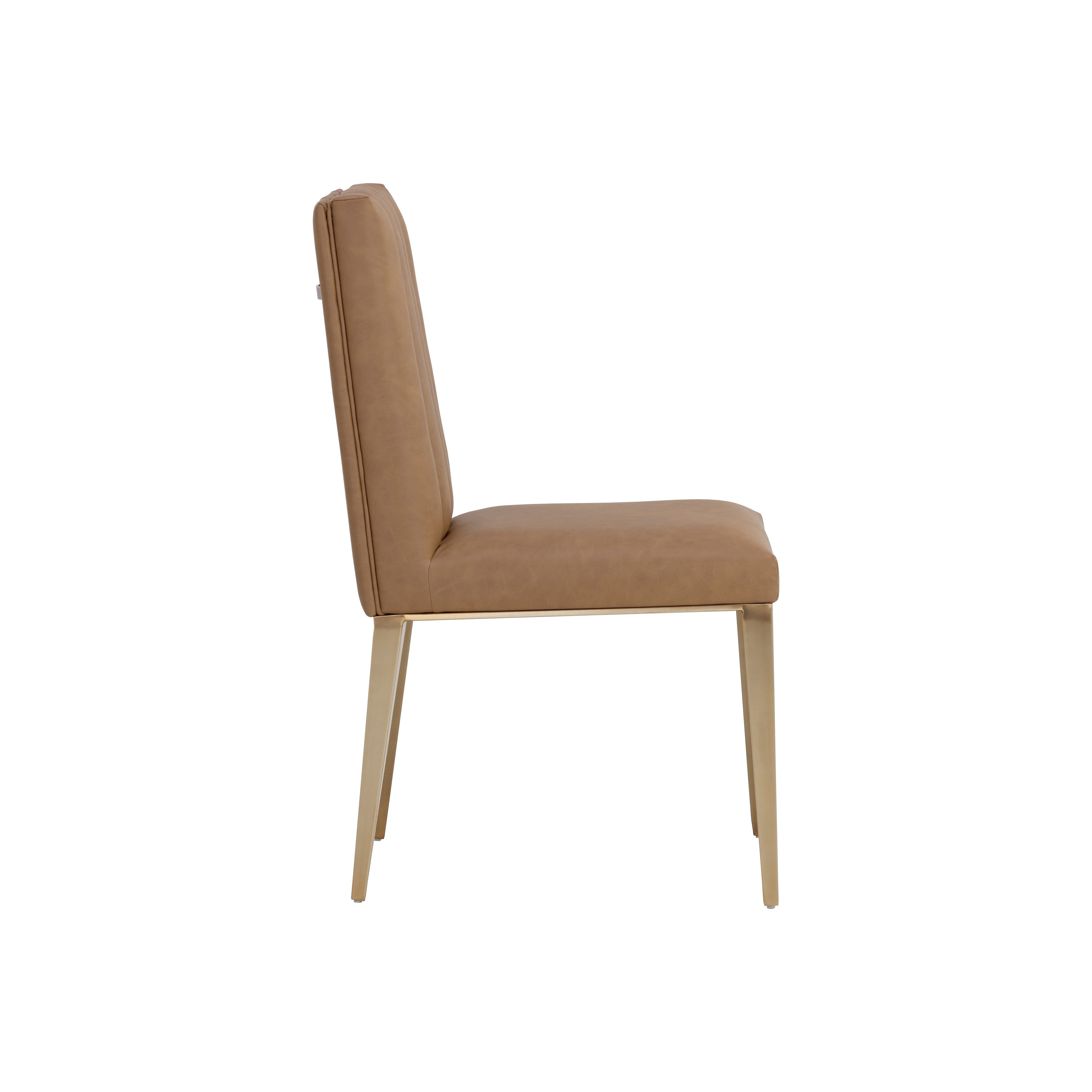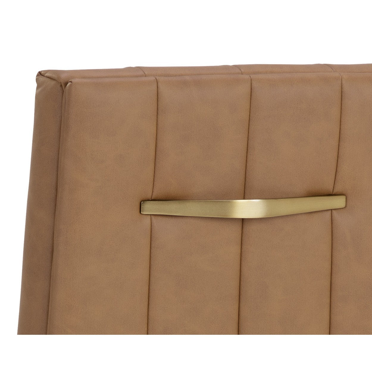 Minimal and classic best describes the Wilbur Dining Chair. Upholstered in milliken cognac faux leather with vertical channeling on the back seat for added flair. Finished with powder-coated stainless steel legs and a matching decorative handle.