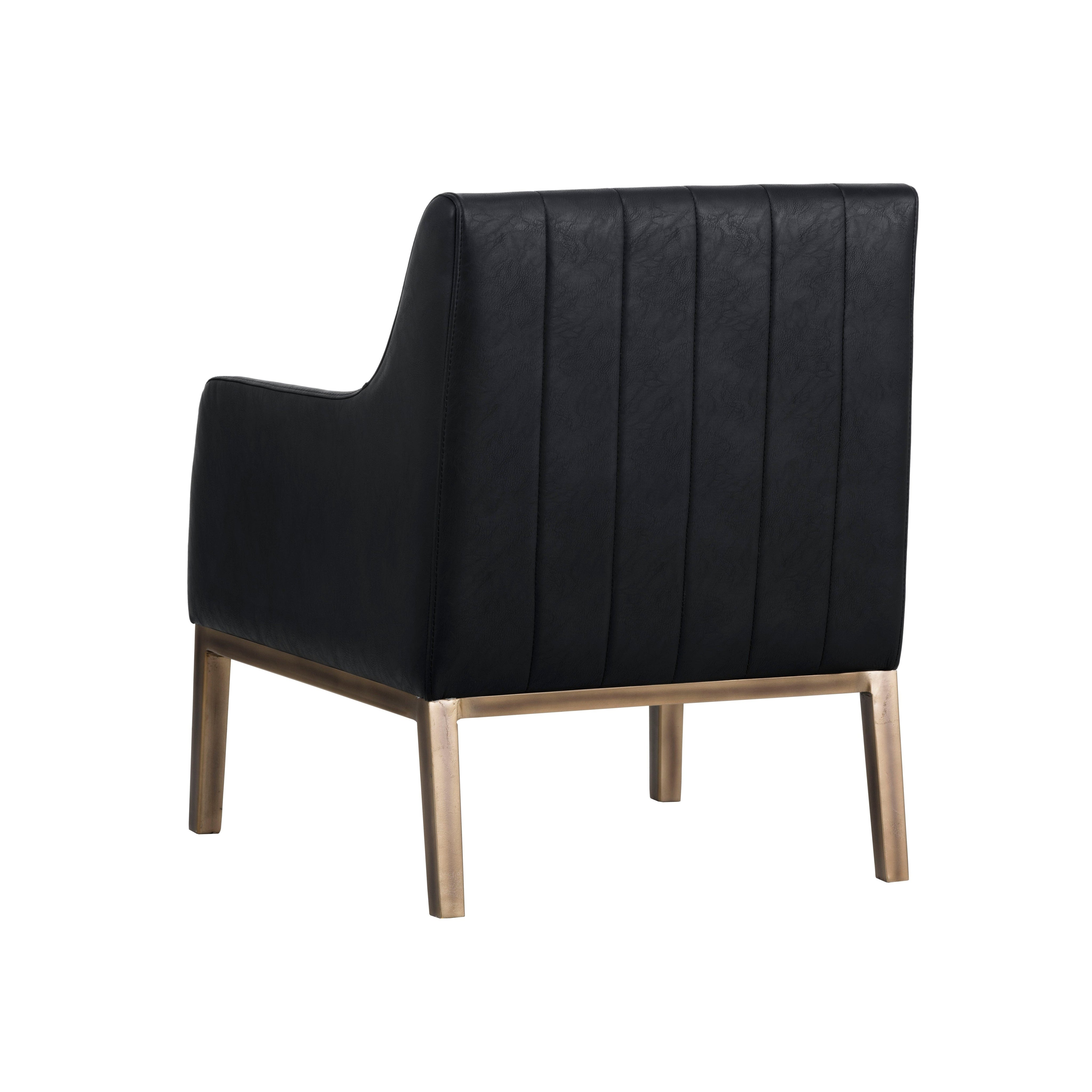 A retro lounge chair featuring channel stitching on the seat and seat back in bravo black faux leather. Finished with a rustic bronze steel frame. Designed for comfort and urban appeal. Handle With Care: This design has been crafted with faux leather. Faux leather is manufactured to reflect the natural characteristics of leather; as such, colour variations, markings, wrinkles, grooves, and light scratches are appreciated characteristics. No two pieces will be alike. Visit our Product Care page for more information on how to ensure the lasting beauty of this piece.