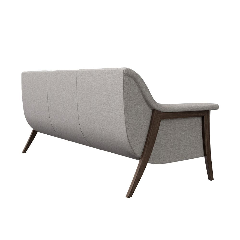This stunning sofa is an artistic tribute to mid-century modern design. A fluid body stands on tapered legs made of solid wood, and invites you to relax into the slight recline of its form. The contrasting materials and relaxed form of this sofa make it the perfect piece for a beautiful and eclectic space in your home.